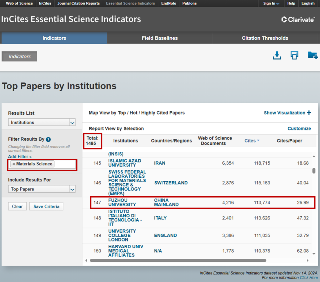 融媒中心讯/根据科睿唯安2024年11月更新的ESI数据,福州大学材料科学学科首次进入ESI全球前1‰行列,所处千分位为0.990‰,总被收录论文为4216篇,总被引数为113774次,全球排名位居第147名,国内排名位居第47名。这是福州大学继化学学科、工程学学科之后,第三个进入ESI全球排名前1‰的学科,为学校第二轮“双一流”建设的又一项标志性成果,福州大学“建设具有若干世界一流学科的国际知名高水平大学”取得了阶段性成效。