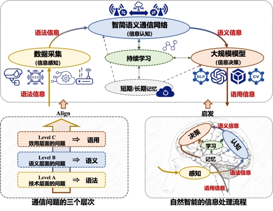 语义层作为核心枢纽,承担信息认知与智能语义通信的重任——系统不再纠结于比特级的无误传输,而是对数据进行深度理解与提炼,提取核心语义信息后通过智简网络传输,实现“传意而非传数”;