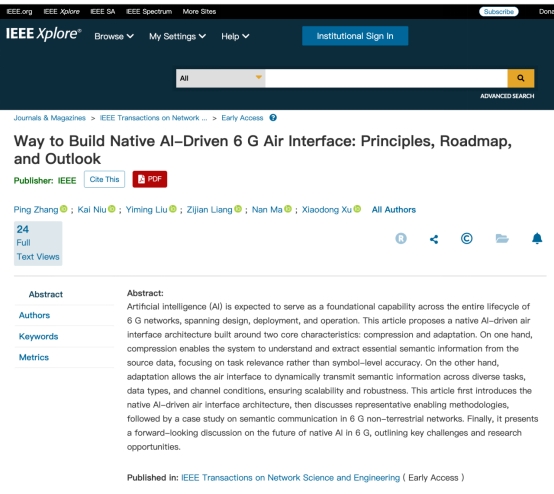 《构建原生AI驱动的6G空口之路》论文发表截图