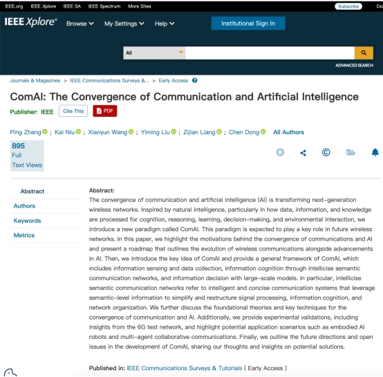 张平院士团队深刻洞察这一思想与范式局限,在IEEE Communications Surveys and Tutorials期刊发表的纲领性论文《ComAI:通信与人工智能的融合》中,首次系统性提出“ComAI”新范式,一场通信技术的“范式革命”就此开启。ComAI的核心要义,是让通信与AI摆脱“工具与被优化对象”的从属关系,实现从底层机制到顶层架构的“原生融合”与“协同演进”—— 这如同自然智能中“神经传导”与“认知决策”的共生关系,通信不再是单纯的信号传输通道,AI也不再是附加的优化手段,二者深度交织,共同构成智能信息处理系统的核心。