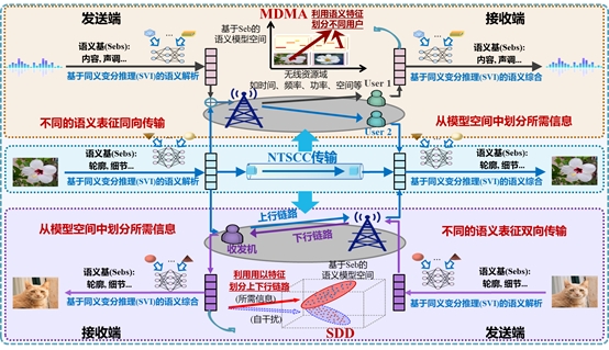 MDMA(模型分割多址接入):这是一项革命性的多用户接入技术。团队发现,不同语义模型产生的信号在语义域上天然具备正交性——就像不同声部的歌手合唱时,各自的旋律互不干扰。基于这一特性,不同用户可以共享相同的时、频、空物理资源,仅凭使用的语义模型不同就能实现无干扰接入,极大提升了频谱效率和系统容量,为 6G 支持海量设备接入提供了新路径。
