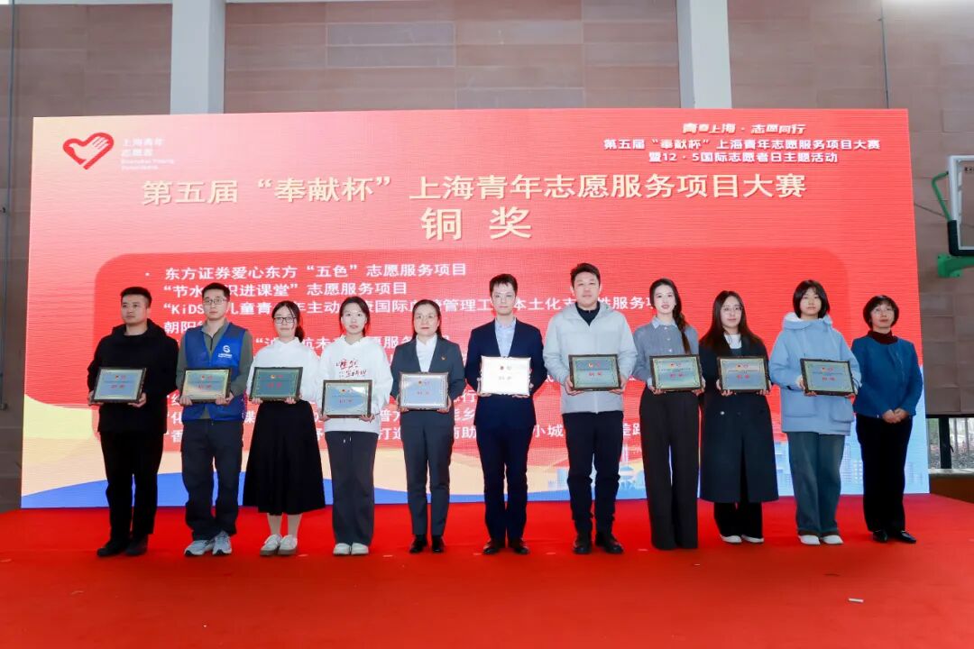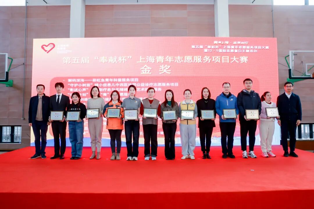 与会领导和嘉宾为第五届“ 奉献杯”上海青年志愿服务项目大赛获得金奖、银奖和铜奖团队颁奖。
