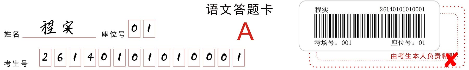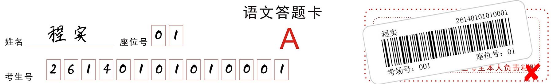 条形码由监考员发给考生,考生应对条形码认真核对,并将其粘贴在答题卡规定的区域内;条形码一律横贴,即条形码中姓名、考生号、考场号、座位号从左向右方向排列,粘贴倾斜度不得超过15度,不可二次粘贴,破损后不予更换;考生在答题的过程中,一定要小心谨慎,切勿污损条形码,要保持条形码的清洁、完整。