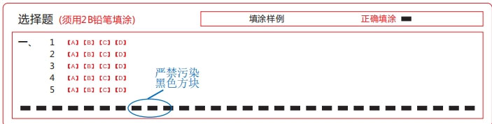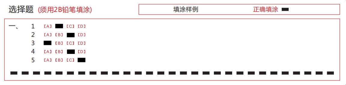 在填涂选项时应作到准、深、满、匀、净:“准”是指涂准位置,不要涂串行; “深”是指选项要涂深,以盖住原印刷符号为准;“满”是指要涂满选项的方框;“匀”是指整个答题卡的所有涂点要涂的基本一致,不要有深有浅差别太大;“净”是指在涂错时一定要用橡皮擦干净。