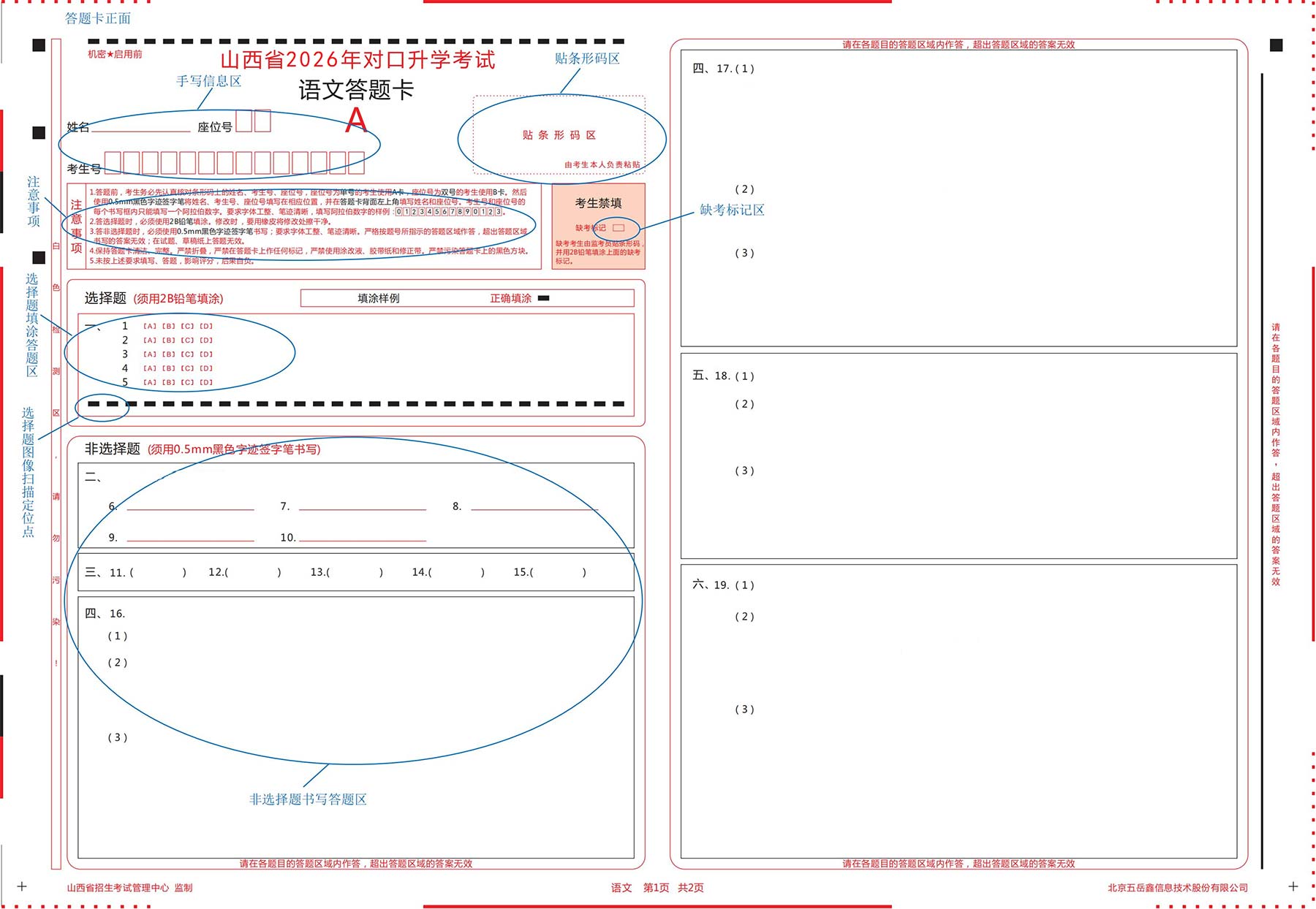 答题卡卡面包括手写信息区;贴条形码区;注意事项区;缺考标记区;选择题填涂答题区;非选择题书写答题区;选择题图像扫描定位点;A、B答题卡识别点;答题卡图像扫描定位点;科目识别点;背面卡头手写信息区共十一个部分。样卡如下: