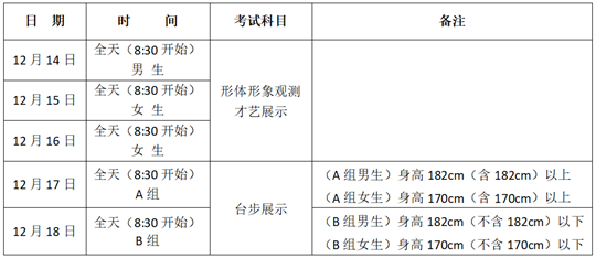 1.形体形象观测、才艺展示:男生2025年12月14日考试,女生2025年12月15日-16日考试。上午8:30考试,下午13:00考试,上午单元未考完,下午单元考试顺延。检录时间为上午8:00-8:45,下午12:30-13:15,未按规定时间检录和参加考试的,视为放弃考试。〔形体形象观测(四楼402室),才艺展示(一楼101