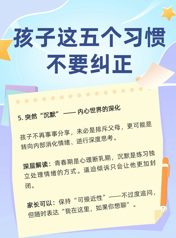 许多家长看到孩子的一些行为,第一反应是纠正。但青春期孩子的某些“问题”,恰恰是独立思考和自我探索的萌芽。强行纠正,反而可能切断他们成长的线索。