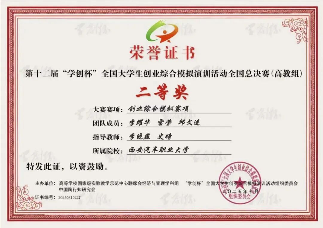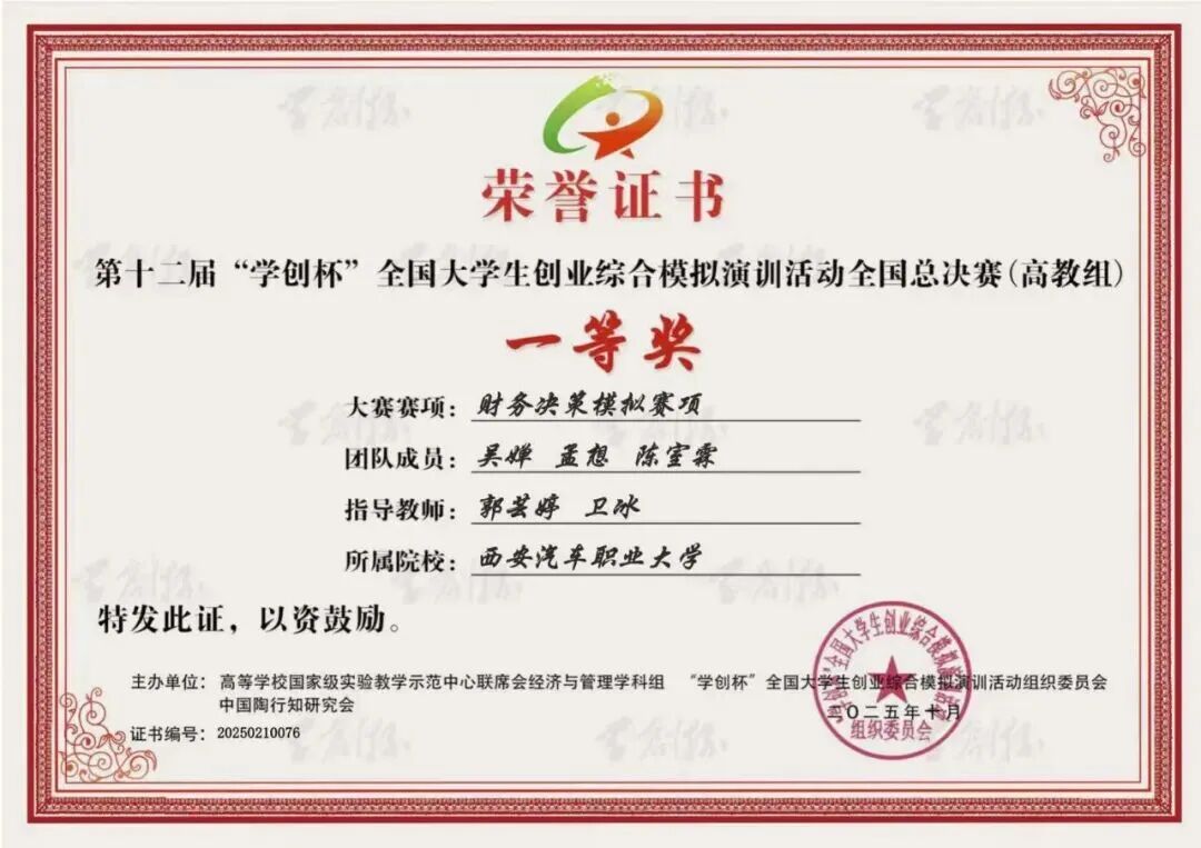 近日,第十二届“学创杯”全国大学生创业综合模拟演训全国总决赛落幕,西安汽车职业大学经济管理学院学子斩获财务决策模拟赛项全国一等奖、创业综合模拟赛项全国二等奖。