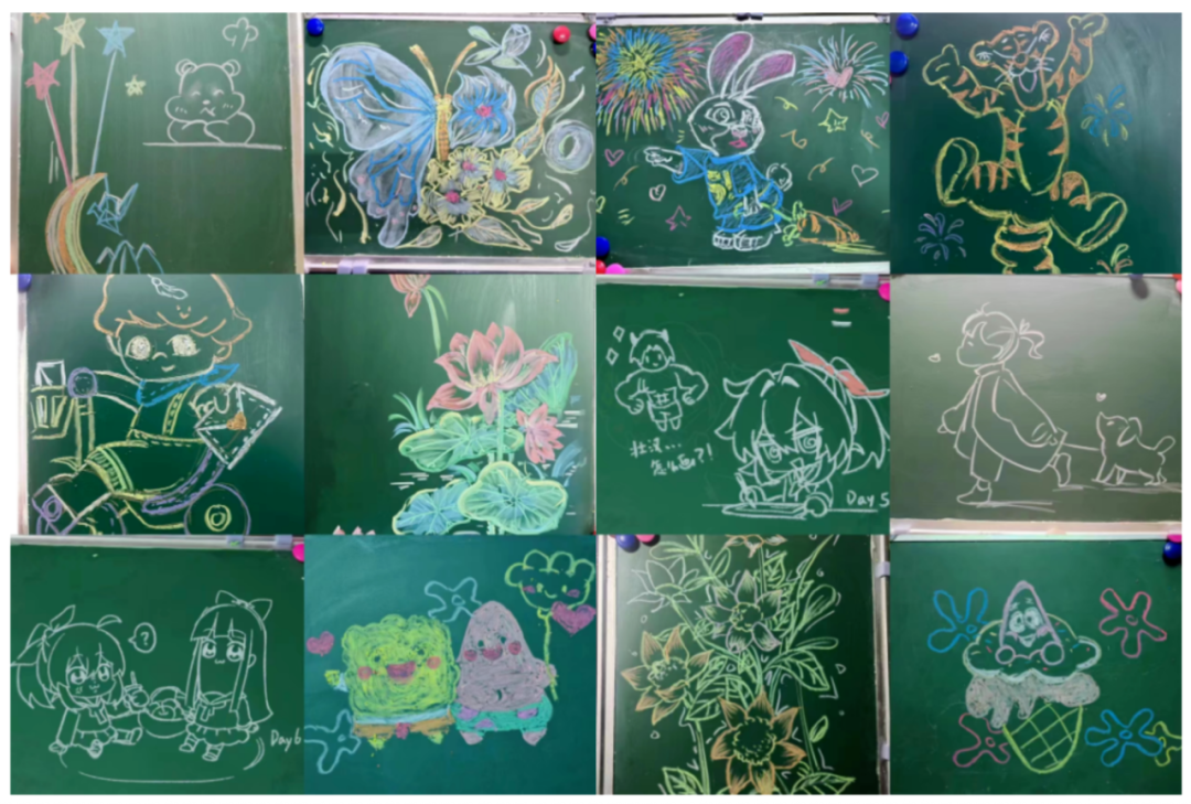 每周一幅粉笔画、粉笔字,五人一组合计24幅;每月一次微格课常规教师技能培训活动,合计10节。