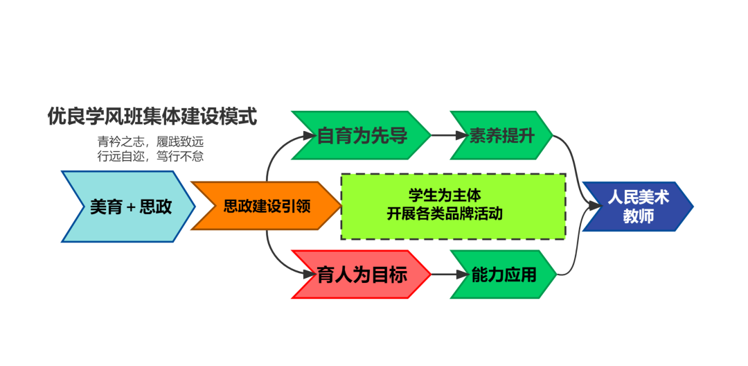 以“以美培元、强学风、重实践” 为目标,构建“美育+思政”的培养模式。以自育为先导,育人为目标从而达到合格的人民美术教师的要求。