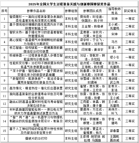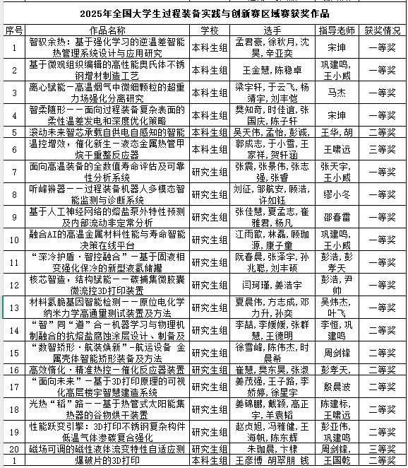 近日,由中国机械工程学会主办,武汉工程大学承办,中国机械工程学会压力容器分会、化学工业出版社协办的第16届全国大学生过程装备实践与创新赛在武汉举行。我校斩获国赛一等奖4项、二等奖3项、三等奖9项,获奖数量再创新高。