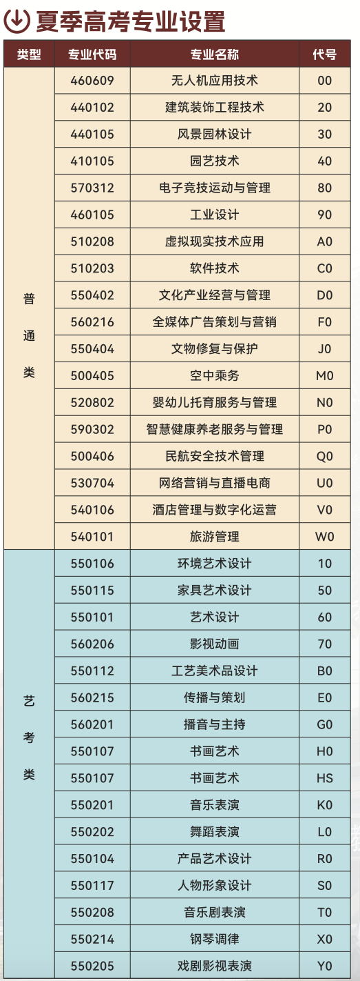 学校目前设有创意设计学院、智慧空间设计学院、音乐学院、舞蹈学院、数字传媒学院、美术学院、航空学院、艺术教育学院、凯文新迈尔数字艺术学院、继续教育学院、国际交流学院等11个二级学院,1个思政课教学部、1个公共课教学部,共计13个教学单位。开设高职专业33个,涵盖文化艺术、新闻传播、装备制造、电子与信息、土木建筑、医药卫生、公共管理与服务、财经商贸、交通运输及旅游等十余个专业大类,形成了传统艺术专业全覆盖,新兴艺术学科有发展,普通类综合专业平衡发展的新局面。