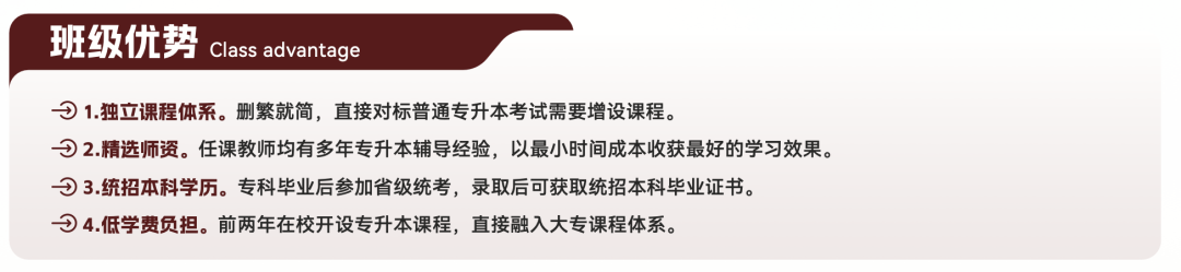 注:本班只提供专升本辅导服务,学生升入本科院校后的教育教学及各项收费标准须按考入院校有关规定执行。专升本本科对应专业以当年实际报考专业为准。以上专业均作为参考。
