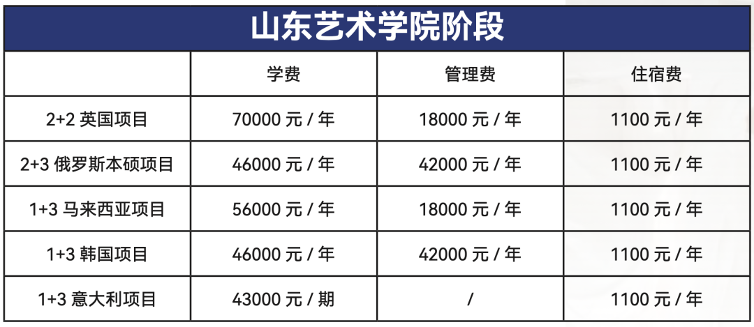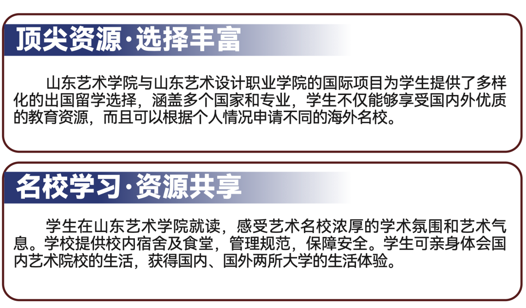 ● 山东艺术学院的1+3或1+4项目,学生第一年在山东艺术学院全日制学习,然后升入国外大学学习三或四年,修满学分后获得国外大学学士学位,本项目帮助学生在国内提前适应海外大学的教学模式和生活方式,平稳过渡到国外继续学习。