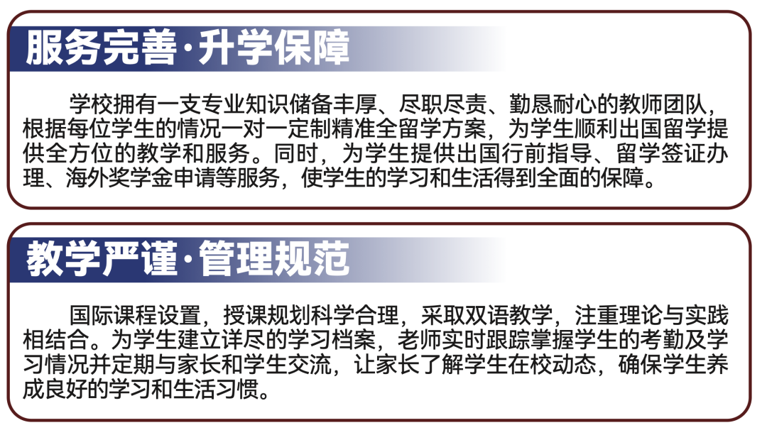 9. 服务保障专业。我校专门成立国际留学服务中心,在教育部留学服务中心指导下为学生出国留学提供全方位保障和服务。