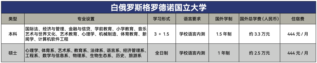 格罗德诺国立大学 , 位于白俄罗斯西北部的格罗德诺州。格罗德诺国立大学成立于 1940 年 2 月 22 日 , 是格罗德诺州科学、文化和教育中心 , 同时也是常年在白俄罗斯综合大学中排名第三的院校。学校是一所综合性的大学 ,下设军事系、机器制造与创新工艺系、教育系、生物学和生态学系、建筑工程系、艺术和网站设计系、历史和社会学系、数学和信息学系、心理学系、旅游和服务系、体育系、经济和管理系、物理技术系、文学系、法律系等多个部门 , 开设了一百多个本科、硕士、副博士、博士专业。
