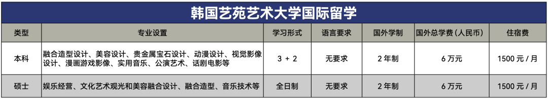 注:学习形式0.5+4招生对象为高中毕业生或同等学历学生,其中前半年在国内就读国际课程进行学分互换,学费为13800元/半年;