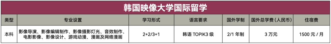 同时在英语之外,开设韩国语作为第二外语,专科毕业前通过韩国语 TOPIK 考试。毕业后,直升进入韩国映像大学的相同或相似专业,再读一年。成绩合格者,可以获得韩国映像大学颁发的本科学士学位证书。
