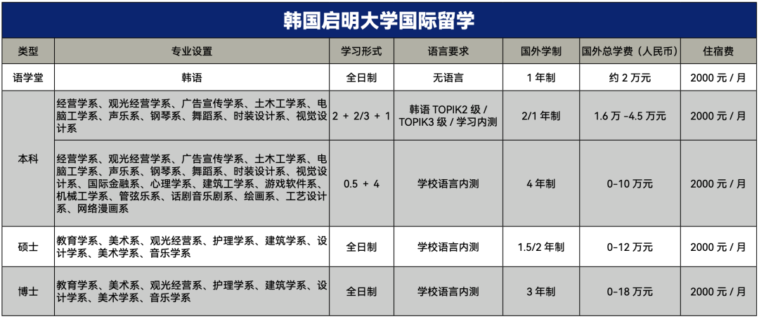 启明大学创办于 1954 年,其最早创办时间可以追溯到 1899 年,是韩国一流水平的重点综合性大学,位于韩国文化教育的中心——大邱市。校园建造是按照美国哈佛大学建筑风格,被称作“东方哈佛校园”。启明大学校园被评为韩国 400 所大学中最美丽的“十大校园”之一,校园规模则排名韩国第九。启明大学五个校区总面积 7500 亩。目前,该校设有 22 个学院、90个专业,13 个研究生院,设有硕士和博士课程,在校生共有 27000 多人。启明大学拥有众多面向中国留学生招收的本科专业,如音乐表演艺术学院的管弦乐系、声乐系、钢琴系、话剧音乐剧系、舞蹈系、使用音乐音响系,美术学院的绘画系、相片摄影传媒系、动漫影像系、网络漫画系、工艺设计系、产业设计系、视觉设计系、服装设计系、纺织品设计系、时尚营销系等。该校现有 3000 多名教职员工,其中有专职教授 600 余名,研究员助教 300 余名,兼任讲师500 余名。该学校所授予的学士学位、硕士学位以及博士学位,均被中华人民共和国教育部承认。