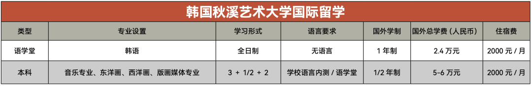秋溪艺术大学是一所韩国艺术界公认的私立艺术大学,也因其教育水平之高、教职人员来自各艺术领域的顶尖人才、有着严格系统的授课方式等因素,在国际艺术领域享有声誉。秋溪艺术大学开设了专科、本科、研究生专业包括:国乐、声乐、钢琴、管弦乐、作曲、实用音乐、东洋画、西洋画、版画、文艺创作、影像情景、影像商务等专业。