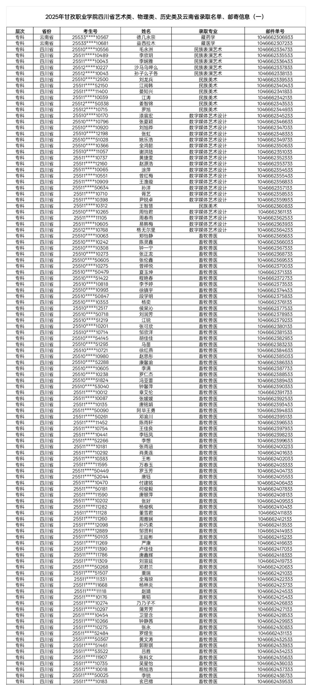 2025年甘孜职业学院四川省艺术类、物理类、历史类及云南省录取名单、邮寄信息(一).xls