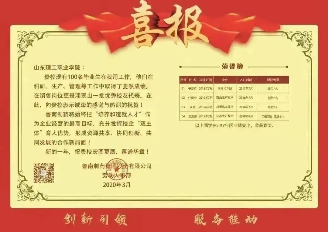 主要就业于鲁抗医药、辰欣药业等知名药企,从事生产、质检、营销等岗位。