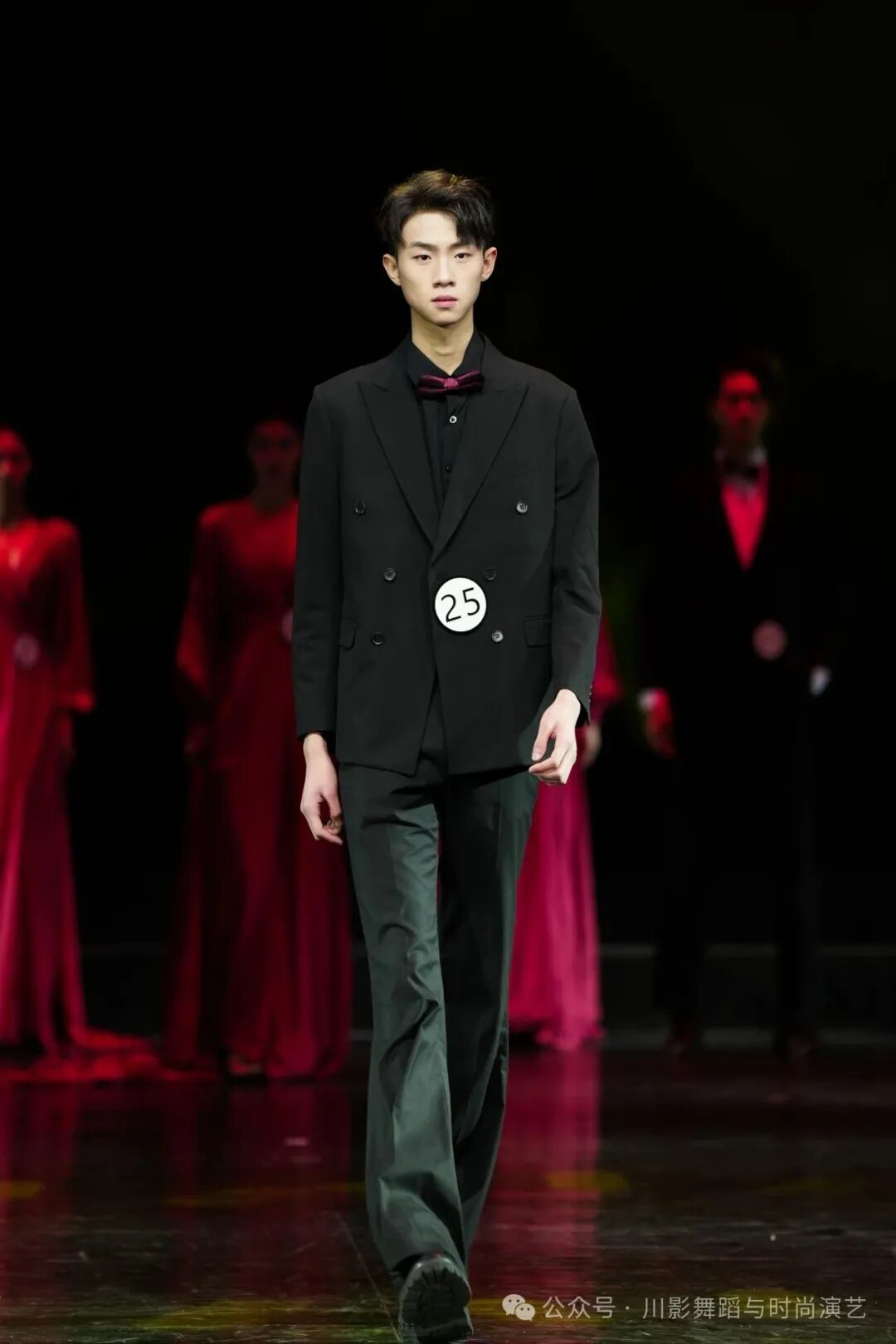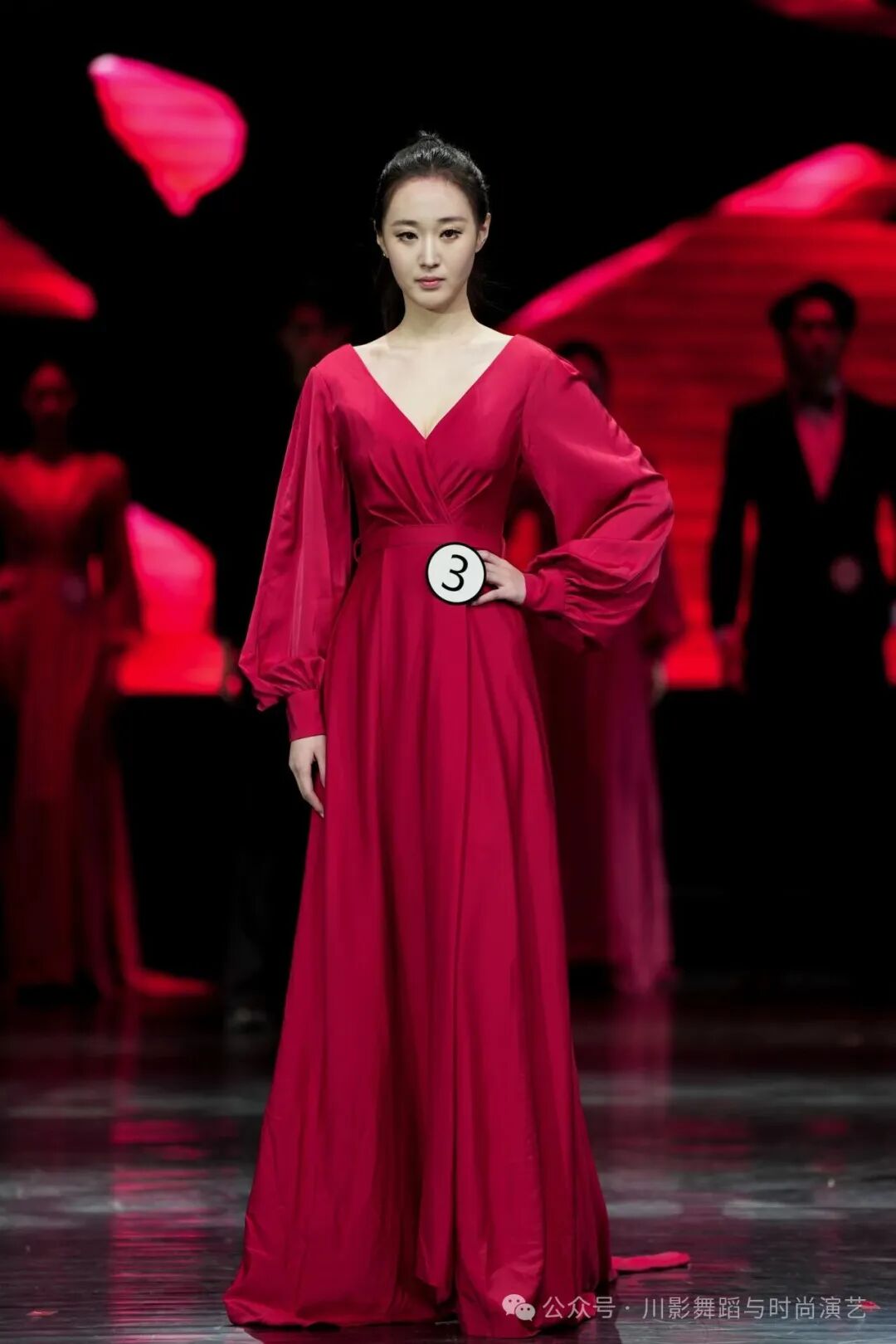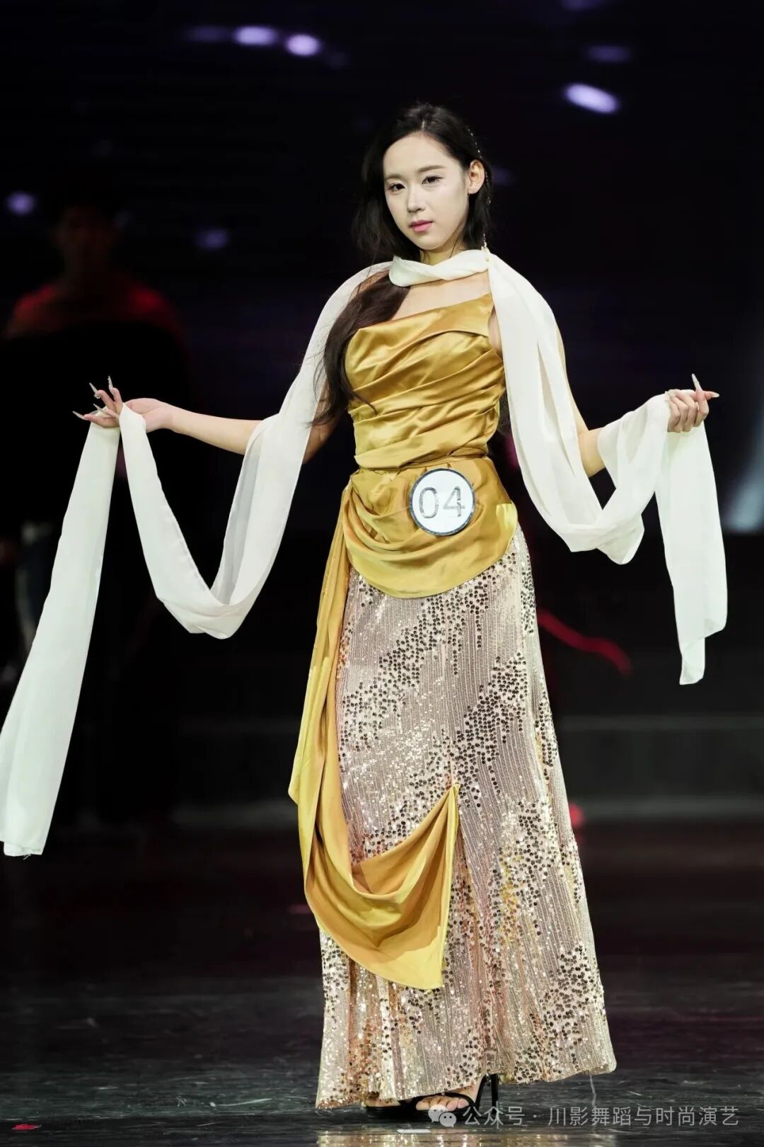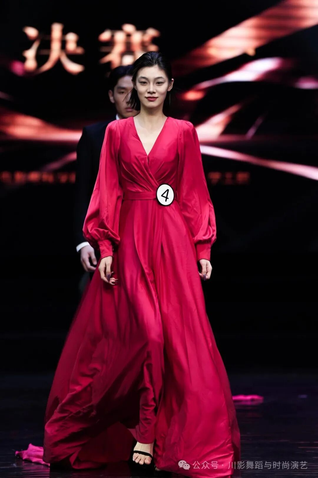 总决赛当晚,现场气氛热烈,座无虚席。舞台上灯光璀璨,选手们精神饱满,自信昂扬。川影学子们以挺拔的身姿为灵动的画笔,以蓬勃的朝气为绚烂的色彩,通过泳装、活力装、时装、礼服等环节的精彩展示,在光影交织间绘就出独属于青春的风尚画卷。