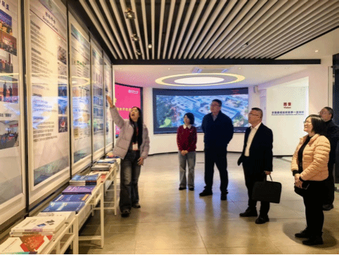 王先锋带领纺织科学与工程学院老师参观东华大学纺织学院成果展厅。