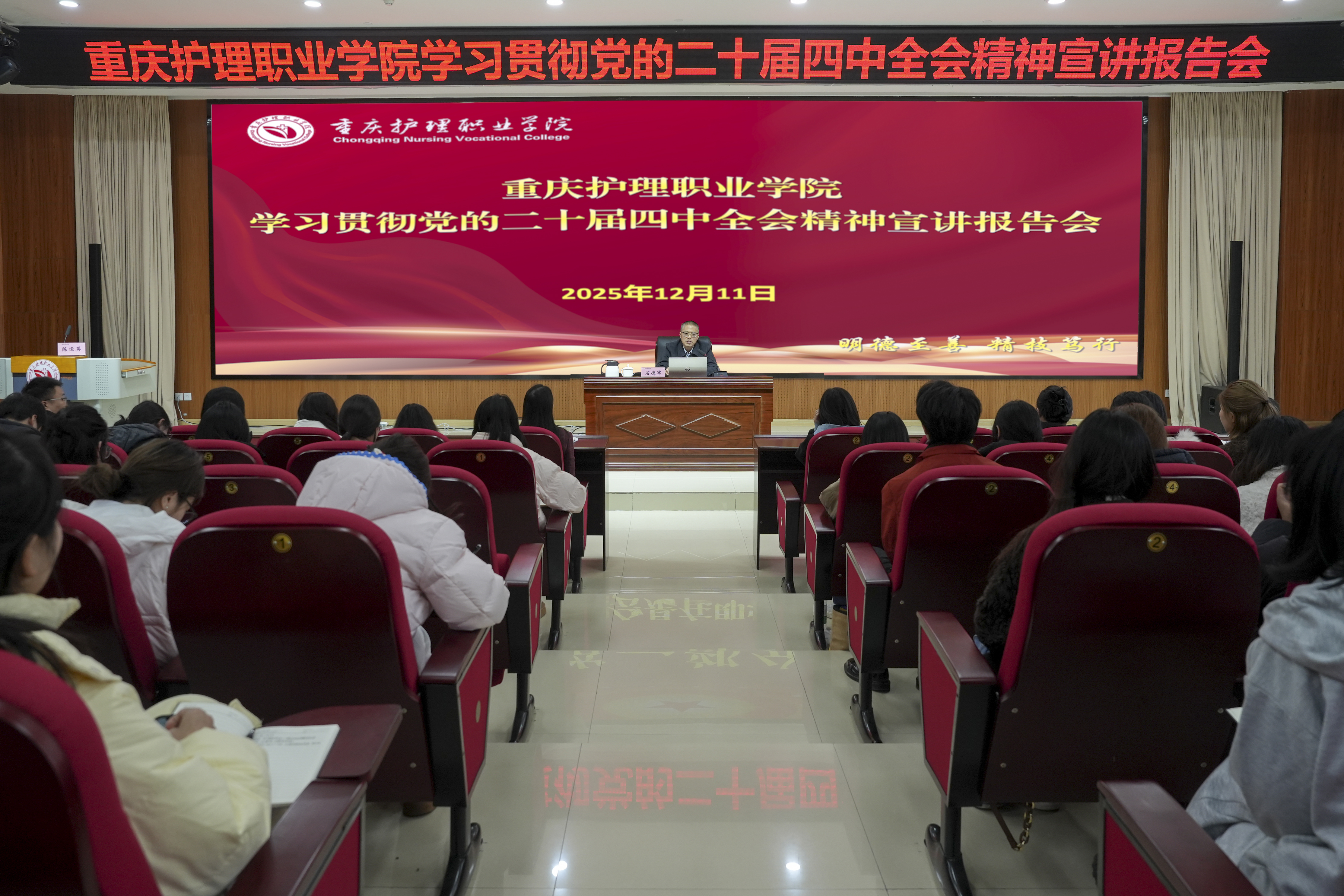 此次宣讲主题鲜明、内涵丰富,既有政治高度和理论深度,又紧密联系实际,对深入理解党的二十届四中全会精神核心要义和实践要求具有重要指导意义。下一步,学校将以此次宣讲为契机,进一步组织师生深化学习,教育引导广大师生切实把思想和行动统一到全会精神上来,将学习成果融入办学治校和立德树人全过程,聚焦服务国家战略和区域发展需求,努力培养担当民族复兴大任的时代新人,为全面推进健康中国建设、实现“十五五”时期经济社会发展目标贡献“重护”力量。