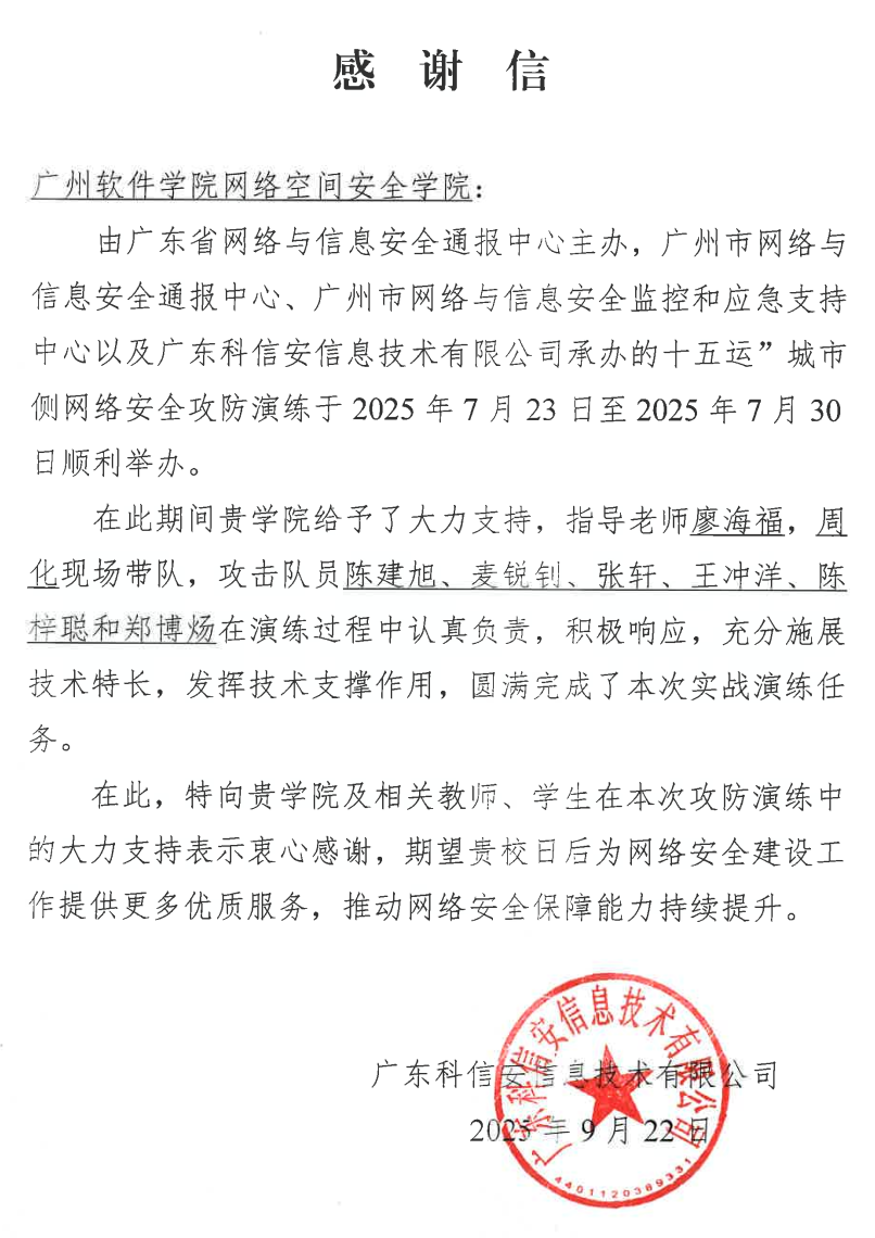 在全运会的精彩赛事背后,我校网络空间安全学院与广东科信安信息技术有限公司一起组织了这样一支队伍。他们坚守在网络安全攻防一线,以专业技术筑牢网络防线。