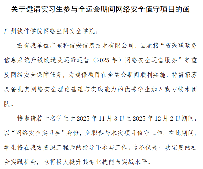 从全运会赛场的全流程网络安全护航到赛后的常态化值守,广软学子以专业素养与执着坚守,完成了跨周期的网络空间安全保障任务。这场以全运会为核心的网络安全实战淬炼,既是他们将专业理论转化为实战能力的练兵场,更是他们践行网络安全青年担当的成长舞台。未来,这群心怀热爱的网络安全青年,必将在守护网络空间安全的征程上步履坚定,绽放更耀眼的青春光芒!