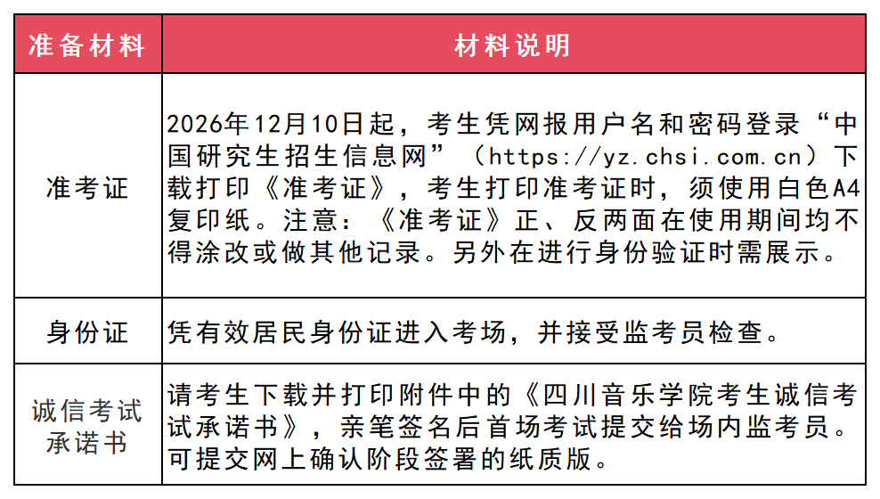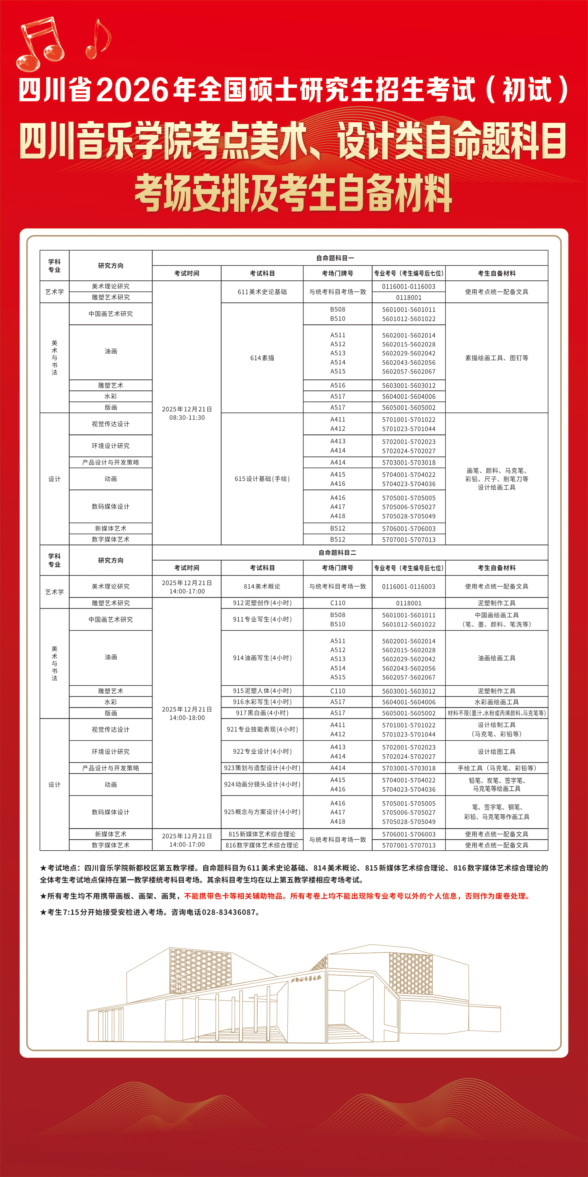 美术、设计类考生自命题科目考场安排见已发布的公告《四川音乐学院2026年硕士研究生招生考试(初试)美术、设计类考场安排及考生自备材料》。