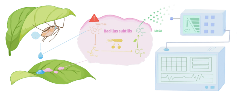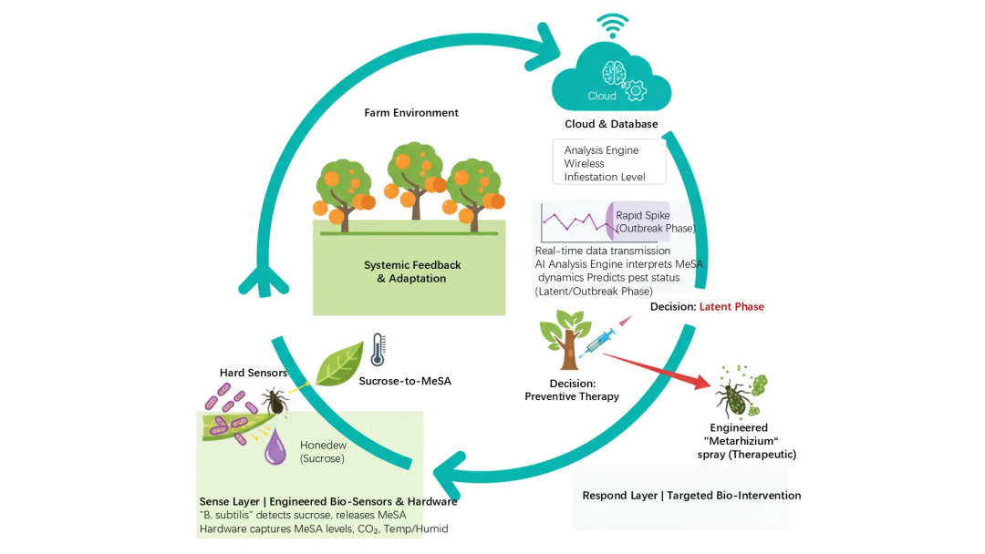 监测方面,由于蚜虫在取食柑橘过程中会分泌含蔗糖的蜜露,根据此特性,团队将工程芽孢杆菌部署在叶表,当它识别到蜜露中的蔗糖时,就会启动诱导响应通路,释放可被传感器捕捉的挥发性信号水杨酸甲酯。基于此,团队设计了Hardware——气体传感器枢纽,它采用STM32微处理器,实时处理来自SGP30气体传感器及温湿度模块的田间环境数据,通过无线传输将数据同步至云端,并借助“柑橘防护”小程序为农户提供虫害防治决策支持,从而解决害虫“难发现”的问题。