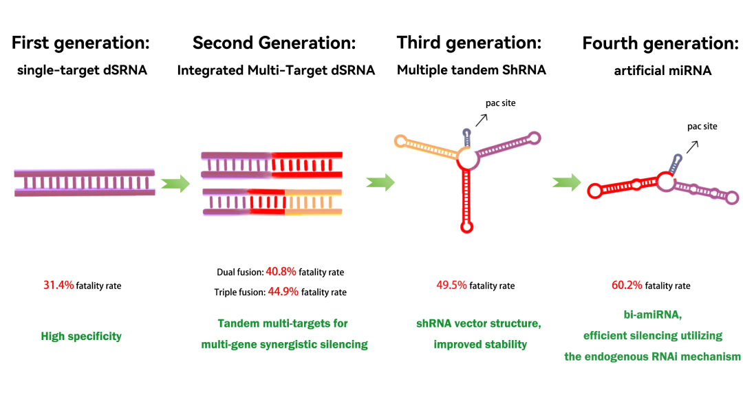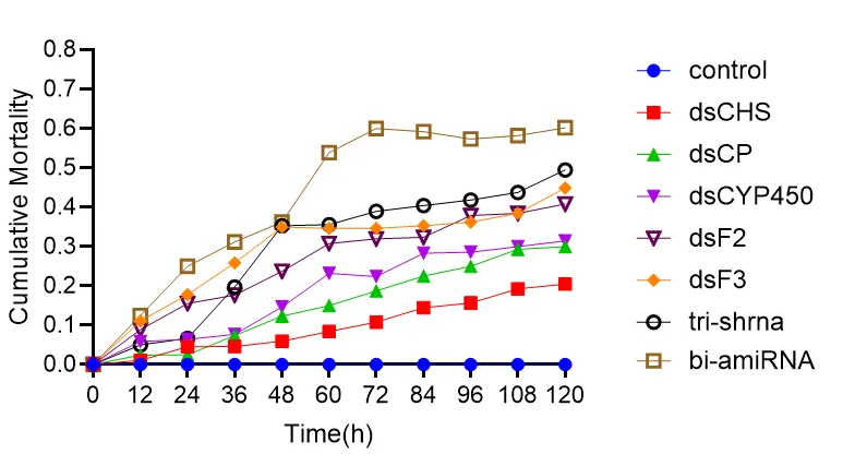 针对抗药性问题,团队采用RNA干扰技术,筛选影响昆虫蜕皮的CHS基因、影响外骨骼形成的CP19基因及影响昆虫解毒作用的CYP450基因,设计单基因与多靶标dsRNA,并进一步开发出多串联shRNA与bi-miRNA结构。实验表明,bi-amiRNA处理5天后蚜虫致死率提升至60.2%,较单基因dsRNA提高三倍。