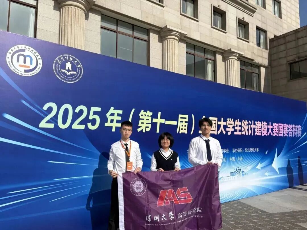 近日,由中国统计教育学会主办的2025年(第十一届)全国大学生统计建模大赛获奖名单正式揭晓。由深圳大学高等研究院(理工创新实验班)2023级本科生黄驿珺、宿博汉、王勇翔组成的参赛团队荣获本科生组全国一等奖,实现了深大在该项赛事中的历史性突破!