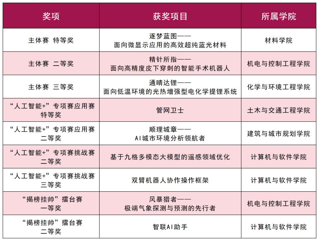 在本届比赛中,深大青年表现优异,刷新深圳大学获奖数历史最好成绩,共计斩获9个“挑战杯”国赛奖项,其中,主体赛特等奖1项、二等奖1项,三等奖1项;“人工智能+”专项赛应用赛特等奖1项、二等奖1项,“人工智能+”专项赛挑战赛二等奖1项、三等奖1项;“揭榜挂帅”擂台赛一等奖1项、二等奖1项。