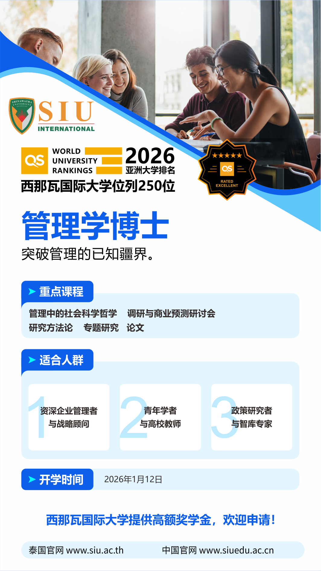 🚀 突破管理的已知疆界🏆 QS亚洲TOP250 · 西那瓦国际大学📌 课程聚焦:管理哲学、商业预测、研究方法论📅 开学时间:2026年1月12日