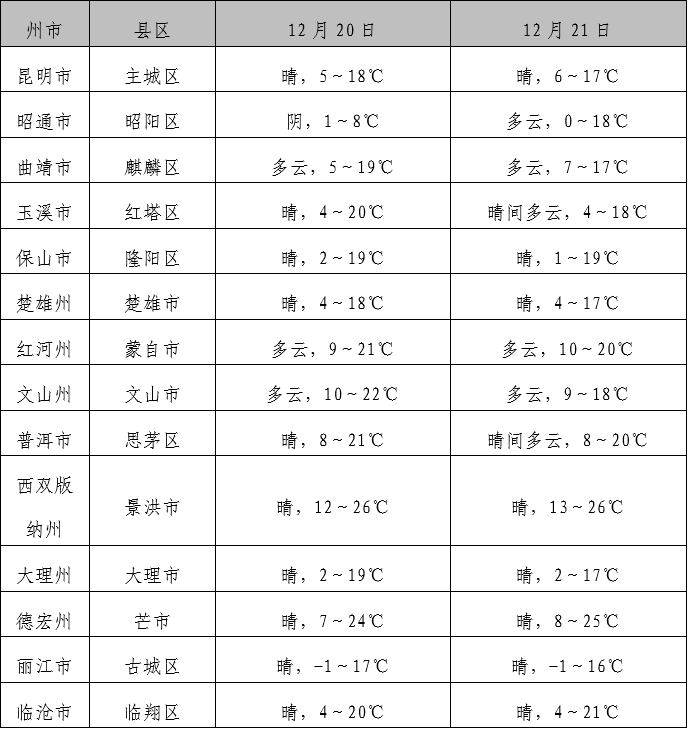 摘要:预计12月20日至21日,受冷空气影响,昭通市、曲靖市东部、文山州东部日最高气温下降4~6℃、局地超过8℃,其他大部地区为晴到多云天气,东部和南部清晨局地有大雾。