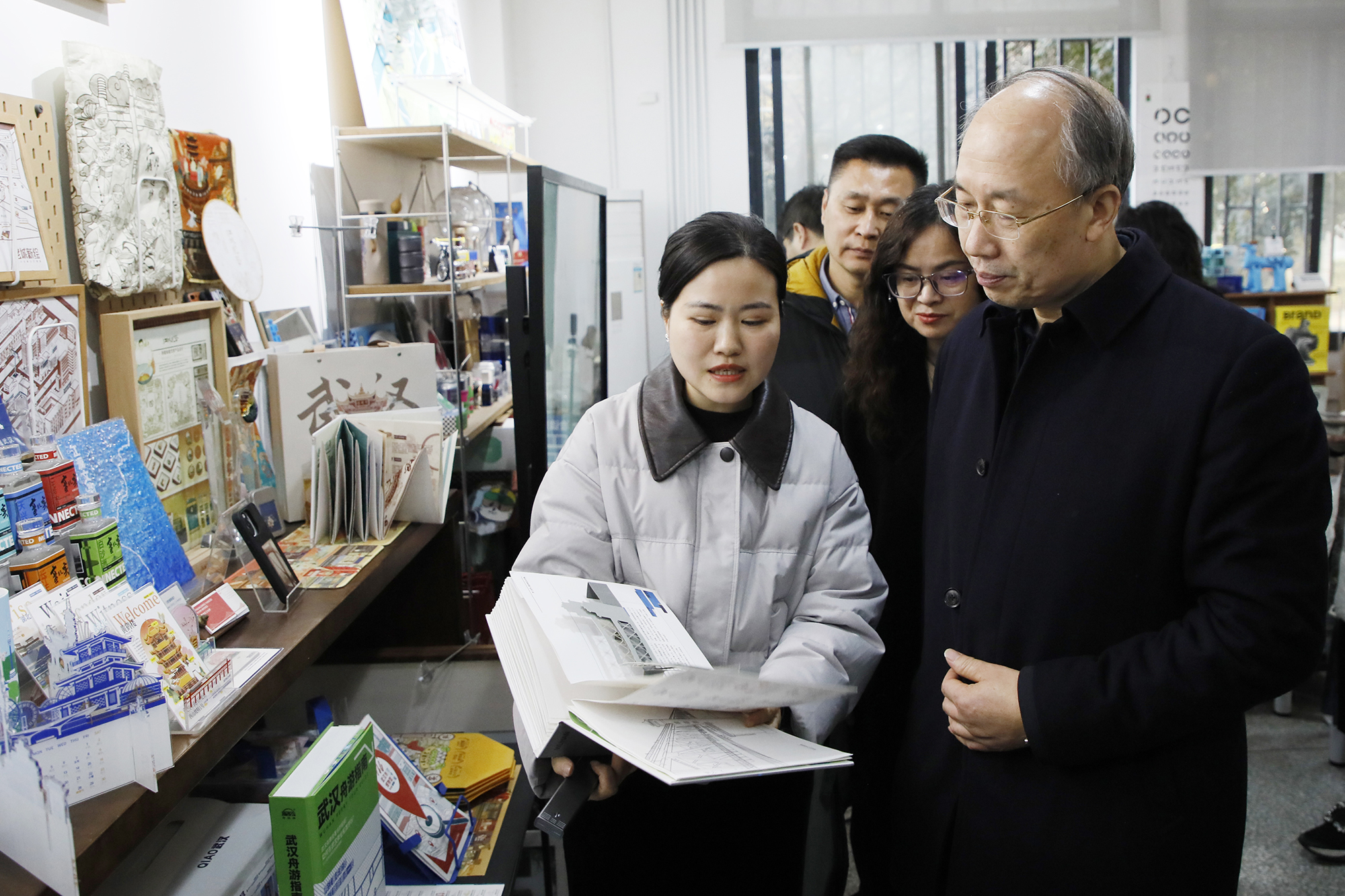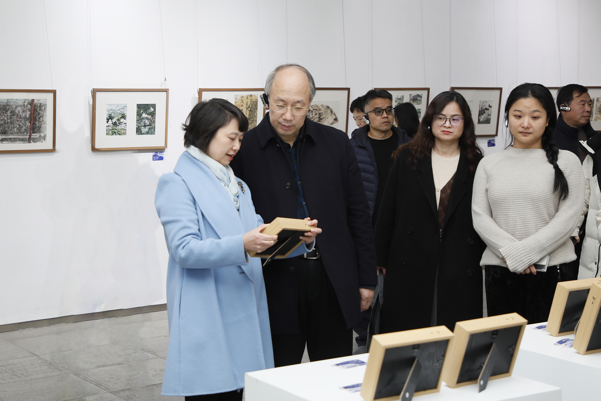 交流会前,在王长华、魏彬陪同下,杨震一行实地参观了学校美术馆以及成龙影视传媒学院、公共艺术学院、时尚设计学院的美育长廊。