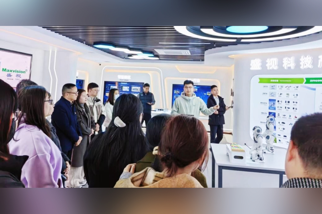 公司代表、2021届校友袁凌志引导学院一行参观了企业发展历程及研发成果展区。通过展板、实物与数字化演示,来访团队深入了解了企业的技术实力与创新环境。现场,由盛视科技研发的NAO机器人进行了功能演示,其精准的动作控制和流畅的交互能力,展现了公司在智能机器人领域的技术水平。参观期间,企业代表还重点介绍了其在智慧口岸领域的核心技术,阐述了“智慧口岸+机器人”的创新应用模式,并结合轮式/足式巡检机器人、旅检场景引导机器人等具体案例,讲解了前沿技术的实际应用。此外,代表亦就公司整体发展现状及行业布局作了简要说明。