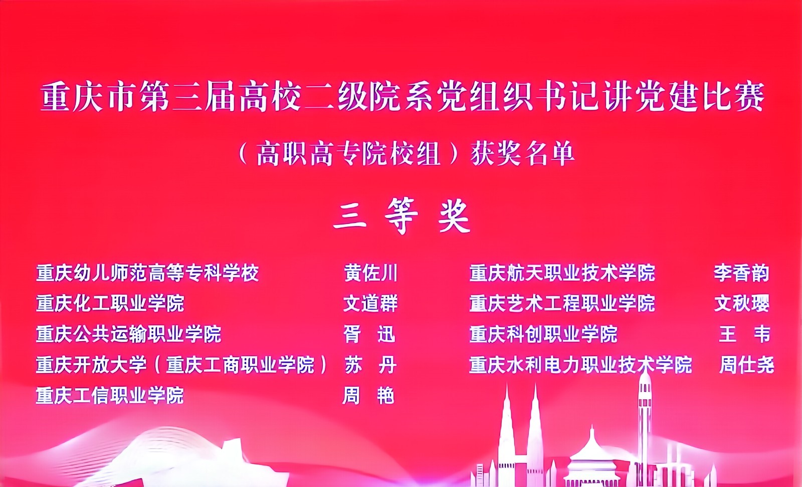 近日,在中共重庆市委教育工作委员会举办的第三届高校二级院系党组织书记讲党建比赛中,我校造型与服装学院党支部书记文秋璎荣获高职专科院校组三等奖。