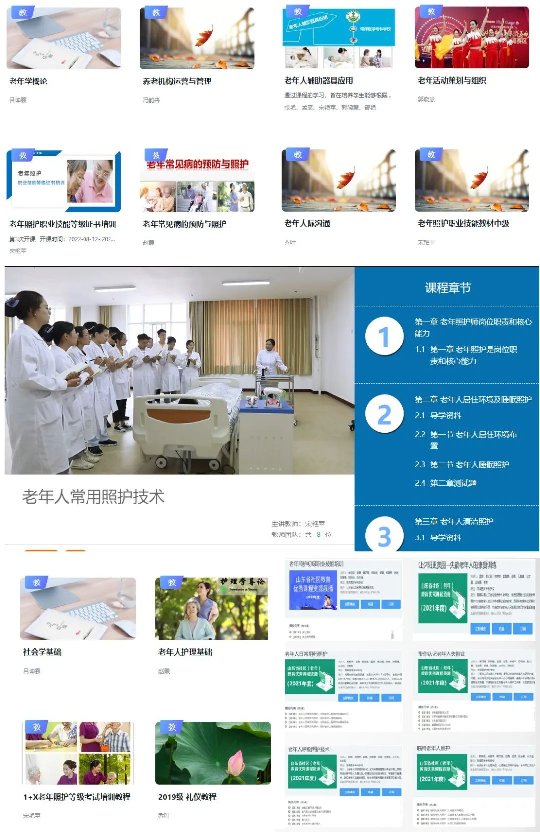 山东省职业教育一流核心课程(线下)省级培育项目1项,山东省职业教育在线精品课程1门,民政部培训中心优秀网络培训教程1门,山东省继续教育数字化优质课程1门,山东省社区教育优秀课程10余门,校课程思政示范课5门;开发了校本教材多本。