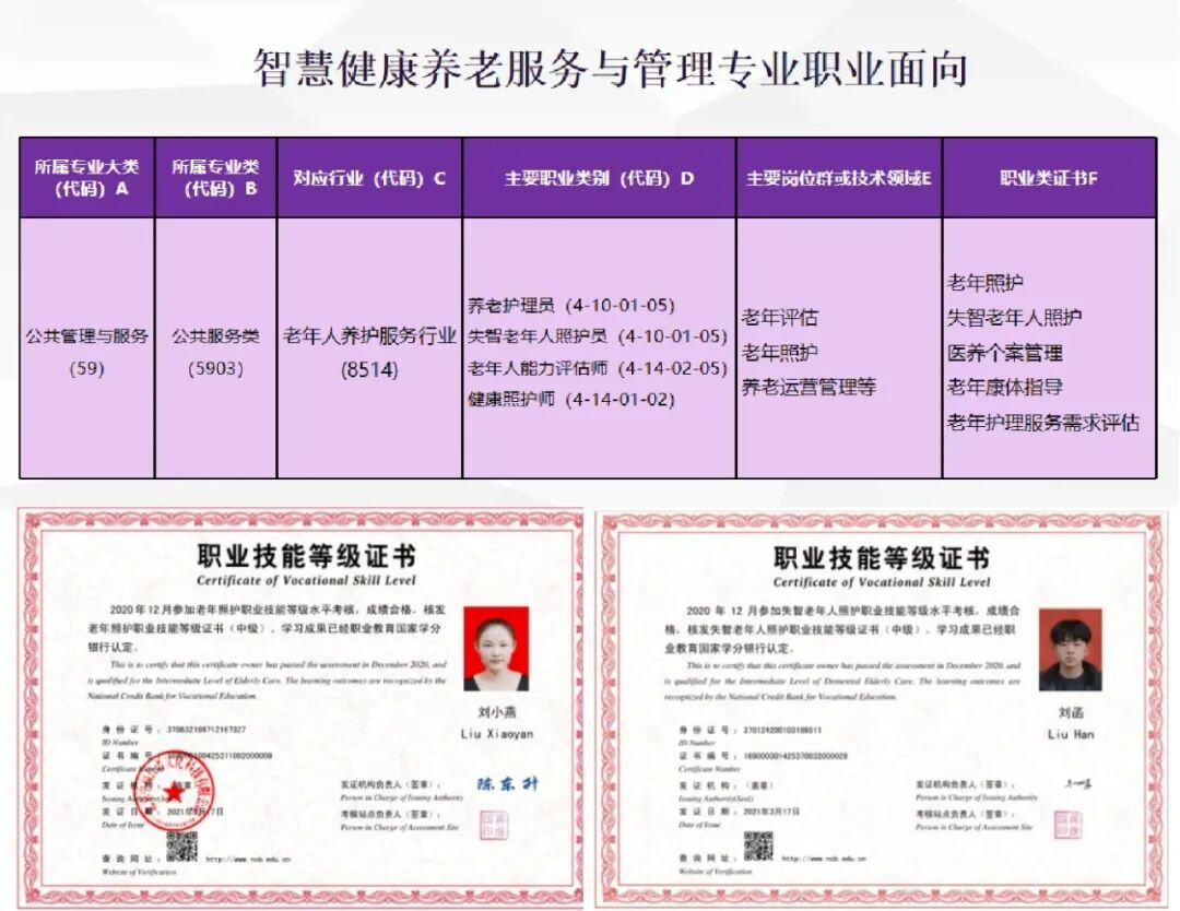 学生在校期间就可以参加老年人照护、失智老年人照护等职业技能中级证书和养老护理员高级证书考核,毕业后可以考取养老护理技师、健康管理师、老年人综合能力评估师等证书。
