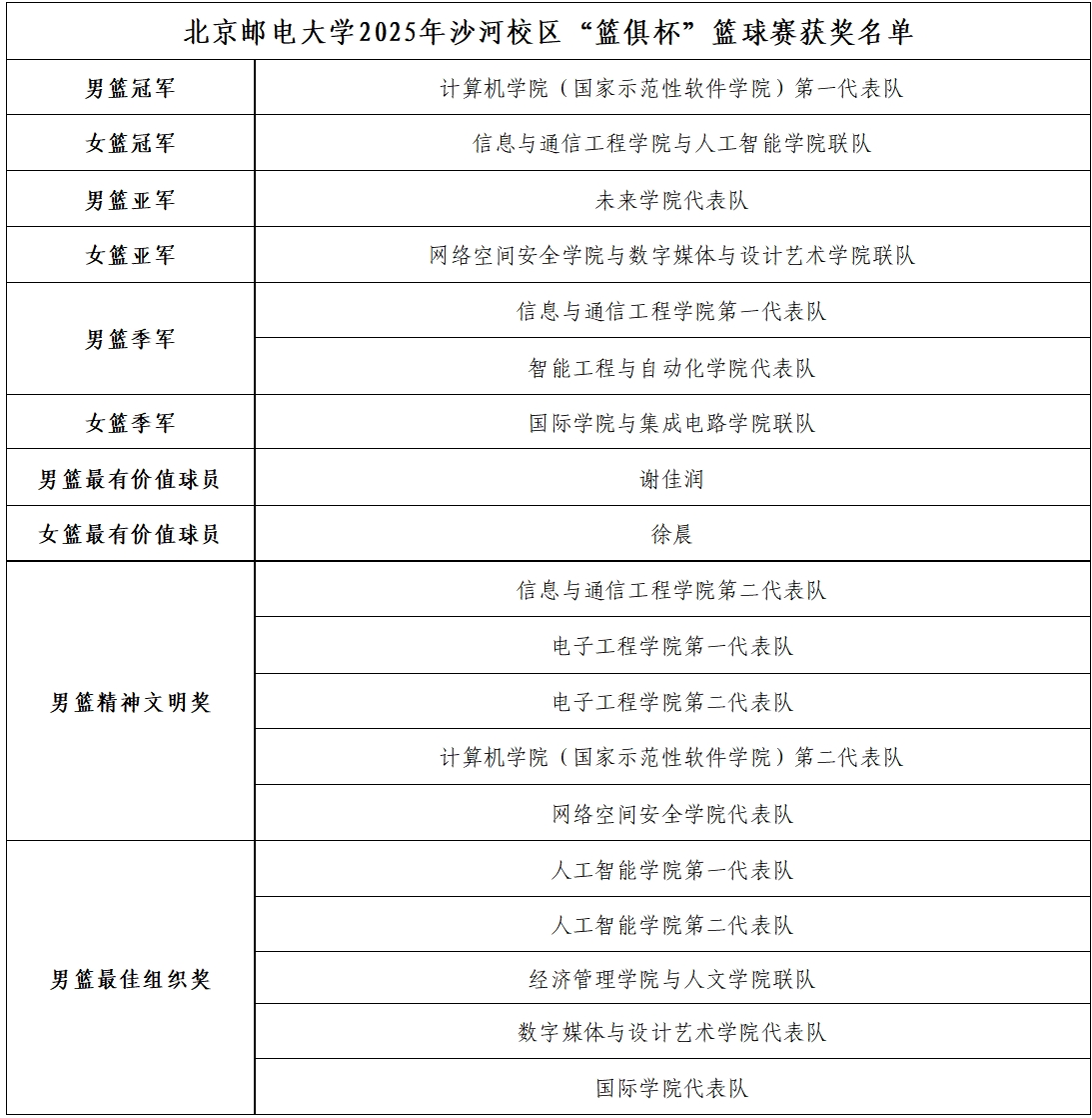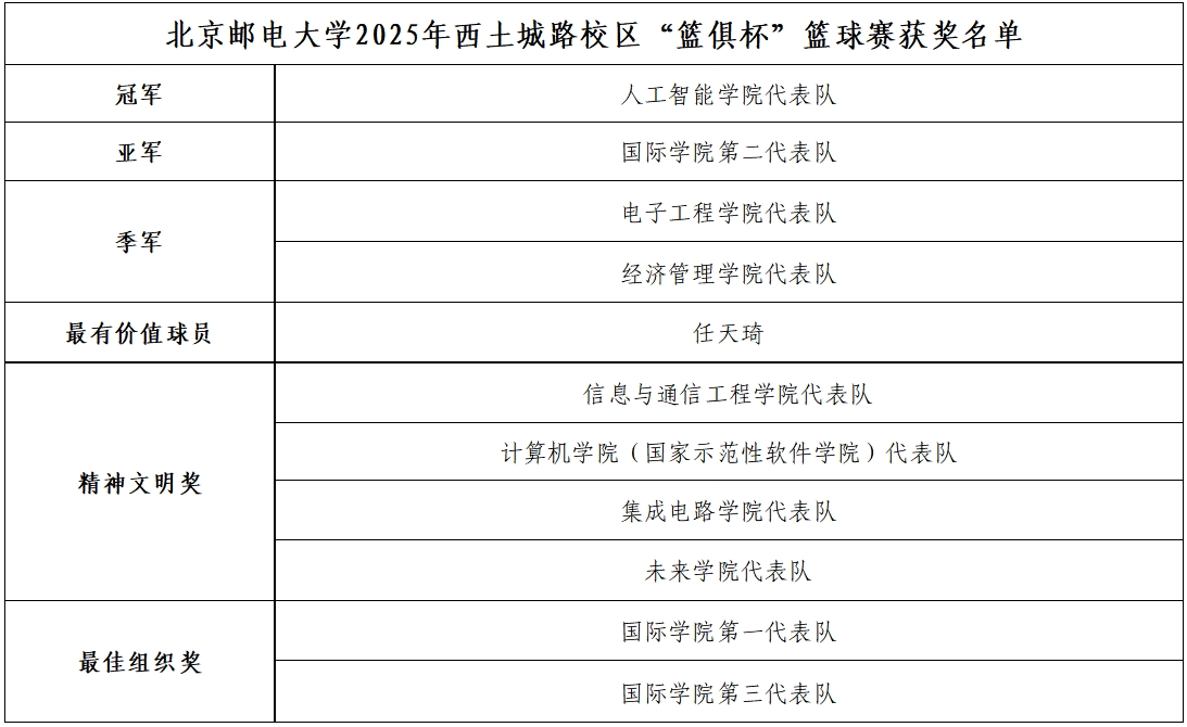 本届“篮俱杯”篮球赛于10月18日正式开赛,历时近两个月。经过小组赛、淘汰赛的多轮激烈角逐,沙河赛区男篮冠军队计算机学院(国家示范性软件学院)第一代表队与西土城路赛区冠军队人工智能学院代表队晋级总决赛脱颖而出,成功晋级总决赛。巅峰对决中,双方队员全力以赴、攻防交错,最终人工智能学院代表队凭借稳定发挥斩获本届赛事总冠军。