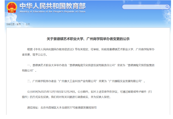 12月18日,教育部公布了《关于景德镇艺术职业大学、广州商学院举办者变更的公示》,景德镇艺术职业大学举办者由“景德镇陶瓷文化旅游发展有限责任公司”变更为“景德镇陶文旅控股集团有限公司”;广州商学院举办者由“广州康大工业科技产业有限公司”变更为“广州康程实业发展有限公司”。