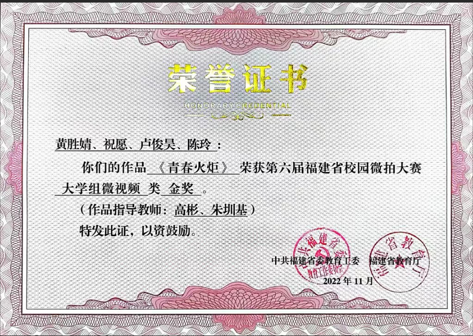 学生获得第六届福建省校园微拍大赛大学组微视频类金奖
