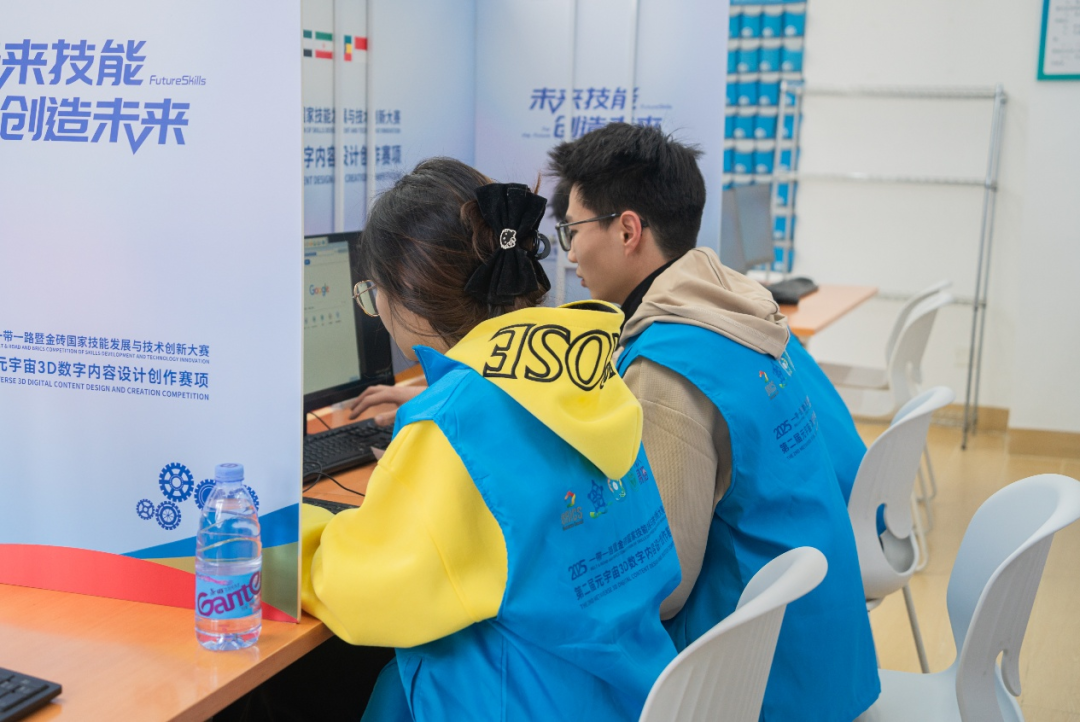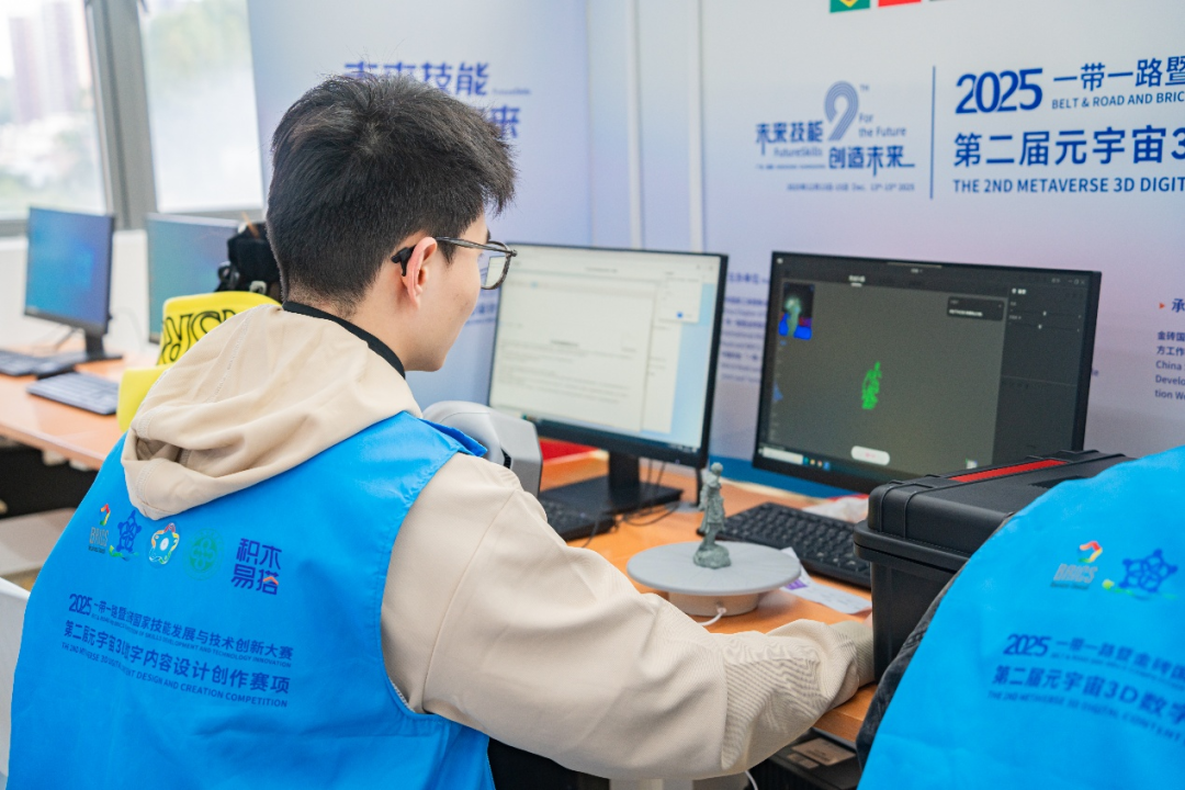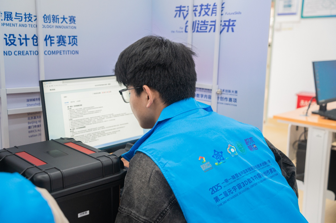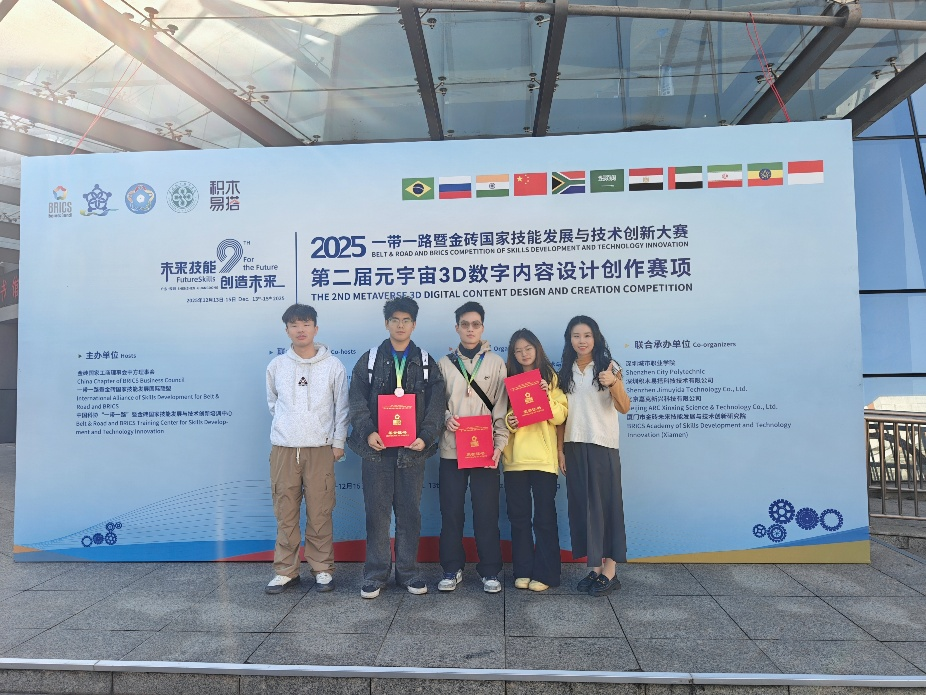 作为响应“一带一路”倡议和金砖国家合作机制的高规格国际技能赛事,本次元宇宙3D数字内容设计创作赛项聚焦元宇宙技术应用与数字内容创新,吸引了全国多省份数十所高职院校的优秀团队同台竞技。赛事要求选手融合3D建模、数字场景构建、交互设计等核心技能,展现元宇宙内容创作的专业性与创新性。备赛期间,学院高度重视,组建了由彭瑶、曾志文老师领衔的专业指导团队,从创意构思、技术实现到作品优化,为学子提供全方位精准指导;陈莹莹、薛冰、胡艺博三位同学利用课余时间刻苦钻研,熟练运用专业软件打磨3D数字内容,针对赛事要求反复优化场景细节、完善交互逻辑,在协作中锤炼技能、突破难点。