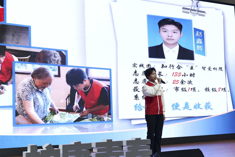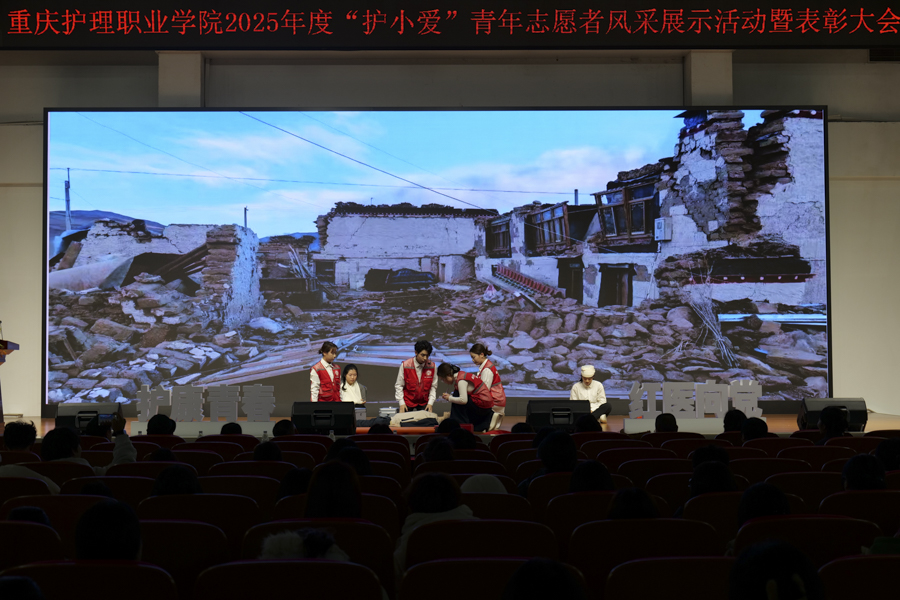 在风采展示环节,“护小爱”青年志愿者代表赵鑫辉同学深情讲述“我的护康青春”志愿服务微故事;第一届志愿服务技能大赛一等奖团队“星急先锋”现场展示急救技能;川渝大学生志愿服务项目大赛银奖项目《耆航助翼》团队作项目交流汇报。