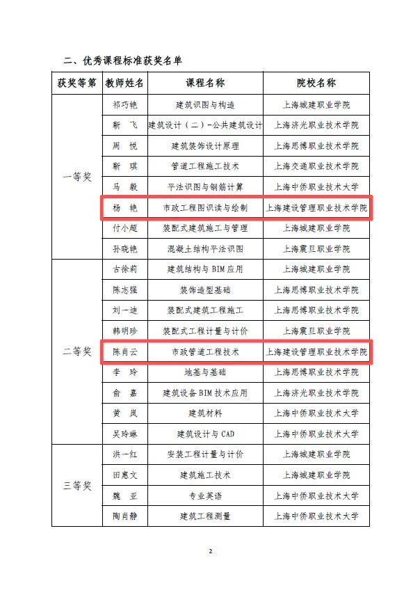 上述成果充分体现了我院在市政工程、管道工程、数字技术与信息化应用等领域课程标准建设的系统性与前瞻性,为专业群高质量发展奠定了坚实基础。以成果促建设,以质量强内涵 学院坚持以服务城市建设和行业发展为导向,持续深化“三教改革”,强化校企协同育人机制,系统推进课程体系重构、课程标准升级和优质教学资源建设,本次多项成果的取得,是学院长期坚持内涵式发展、推动教育教学改革的集中体现。学院将以此为契机,进一步发挥优秀课程与课程标准的示范引领作用,持续提升人才培养质量,为上海城市建设和土建行业高质量发展培养更多高素质技术技能人才。