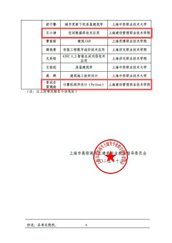在 2025 年上海市高职高专院校土建类专业优秀课程标准评选中,我院多门课程标准脱颖而出,杨艳老师主持的课程标准《市政工程图识读与绘制》荣获一等奖;陈肖云老师主持的课程标准《市政管道工程技术》荣获二等奖;王小清老师主持的课程标准《空间数据库技术应用》荣获三等奖;晋成名、雷婉南老师共同主持的课程标准《计算机程序设计(Python)》荣获三等奖。